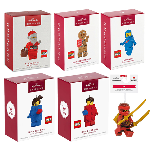 The Hallmark Ornament LEGO Collection 2025 consists of 6 different LEGO minifigure ornaments, 5 of which are from the Keepsake Collection: Santa Claus, Gingerbread Man, Boy, Girl, Spaceman, and Kai.
