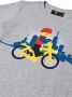 Check out this iconic LEGO T-shirt with a fun print on the front of a LEGO Minifigure on a bicycle. Isn't it nice? The Minifigure is wearing a bicycle helmet and is riding a bike – and there’s a big city as the background. The T-shirt for boys and girls has a rib hem in the neck opening and is made of organic cotton. In one side seam, there is a red LEGO logo.