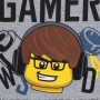 Cool light gray LEGO short sleeve T-shirt. On the front is a print of a LEGO minifigure with the text: 'Gamer, Just one more level...'. The back is plain.