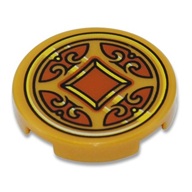 Round LEGO tiles of 2x2 studs with coin pattern.