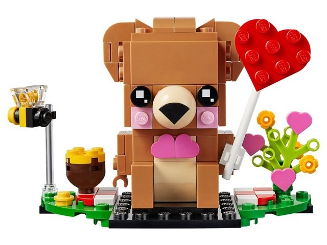• This collectible LEGO BrickHeadz buildable model of a cute brown bear holding a large red heart, sits on a picnic blanket together with his little bee friend, a honey jar and colorful flowers.