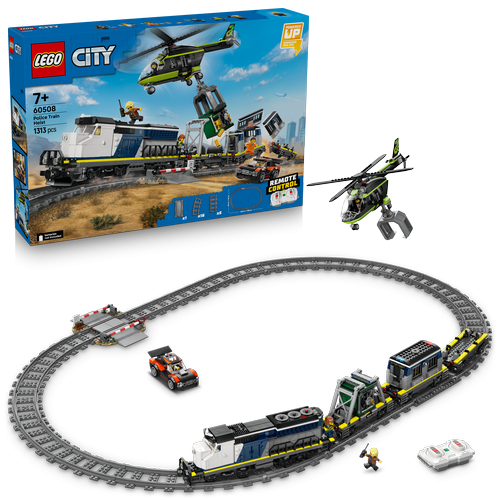 All aboard for nonstop action with the LEGO City Police Train Heist (60508) toy train playset for ages 7 and up. This Powered Up electric train set for kids includes a working locomotive and 3 flatcars carrying a prison cell, bank safe and rally car. The set also includes an oval train track with a railroad crossing and a track piece for re-railing trains. Just add the model helicopter with working grabber claw and the detective, police officer, train driver and 3 crook minifigures for imaginative train heist adventures. This toy train set makes a great surprise treat or birthday gift for 7-year-old boys, girls and kids who love model trains and LEGO building. Add this set to others (sold separately) from the LEGO City range for more exciting adventures. With this LEGO City Police train toy playset, kids can enjoy intuitive building in the LEGO Builder app, zooming and rotating with 3D instructions, saving and tracking progress while they build.