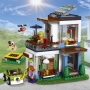 - The Modern Home features a smooth facade with large windows, solar skylight, upper-level bedroom and balcony with parasol, ground-level room, garden area with buildable outdoor wall lamp, trampoline, flowers and trees, plus a charging station and an electric car with minifigure cockpit