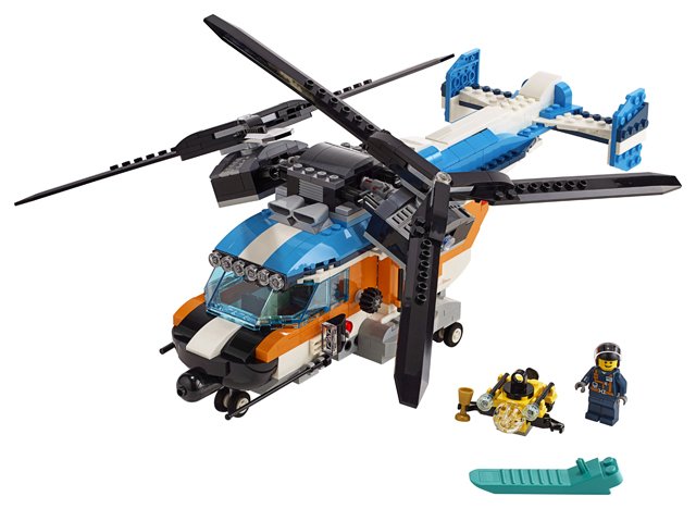 - The Twin Rotor Helicopter features large synchronised rotors, tinted cockpit with 2 seats, opening side and rear cargo bay doors and a working winch, plus an ROV submarine that fits into the cargo bay.