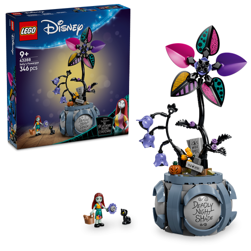 Surprises await kids ages 9 years old and up in this LEGO Disney Sally’s Flowerpot (43288) building toy. This flower building set, inspired by Tim Burton’s The Nightmare Before Christmas, sparks play with 2 LEGO Disney characters: Sally and alittle black cat. There’s a flowerpot with 2 brick-built flowers, hidden rooms and graphic stickers inside and out. The interior space also includes a basket, cauldron, buildable table and much more. The characters can fit inside for storage after play. This building toy for girls or boys 9 years old and up makes a cool floral gift-giving idea for a birthday or holiday. Display this flowerpot alongside other LEGO ǀ Disney building toys (sold separately) to show off a collection. Fulfill a child’s love for imaginative play with a build that also offers fun play options. Kids can build with confidence using the LEGO Builder app – zoom, rotate in 3D and track progress with easy-to-follow digital instructions.