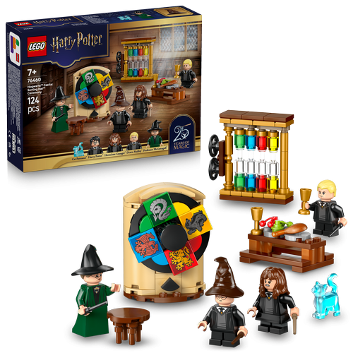Relive the Sorting Hat ceremony at Hogwarts Castle from Harry Potter and the Sorcerer's Stone with this LEGO Harry Potter building set (76460) for kids. A fun Harry Potter gift toy for boys, girls and any fans ages 7 and up, it features 4 LEGO Harry Potter minifigures: Professor McGonagall, Harry Potter, Hermione Granger and Draco Malfoy. Place the Sorting Hat on each student and spin the ’sorting wheel’ to discover which Hogwarts house they will join. A dinner table and house points counter add to the play possibilities. This kids’ adventure kit pays tribute to the first-ever LEGO Harry Potter set (4701), released in 2001, and features one in a series of 25th anniversary collectible Patronuses: Professor McGonagall’s Cat Patronus. This set fits inside Hogwarts Castle: The Great Hall (76435), another in the collection of modular building toys (all sold separately), which together create the most detailed LEGO brick-built Hogwarts Castle scene to date.