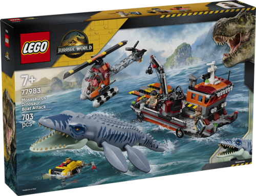 - With this Mosasaurus Boat Attack (77983) set, boys and girls can build an action-packed set inspired by the movie Jurassic World Rebirth.