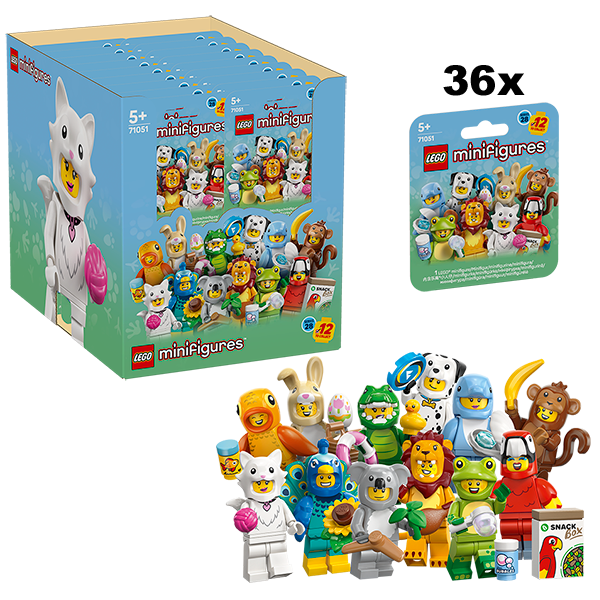 -15% Availability Online status PRE-ORDER Available by: 2 January 2026 Store Gorinchem Not in stock A full unopened box of LEGO 71051 Minifigures Series 28 Animal Costumes with 36 boxes! Girls and boys ages 5 and up can play out fun stories with 1 of 12 collectible figures from the LEGO Minifigures Animal Series 28 (71051) small animal toy mystery boxes. There is 1 surprise LEGO minifigure in each box and a total of 12 charactersto collect including toy figures wearing parrot, lion, frog, crocodile, Dalmatian, goldfish, cute bunny, peacock, fluffy cat, koala, dolphin and monkey costumes. Each of the 12 minifigures comes in a sealed mystery box, and all are accompanied by at le ast 1 accessory. These detailed cute animal toys can be added to an existing collection, proudly displayed or used to create fun-filled stories. This small gift for kids who like animals and nature is a fun treat and inspires great storytelling and countless hours of playtime on their own or with friends.
