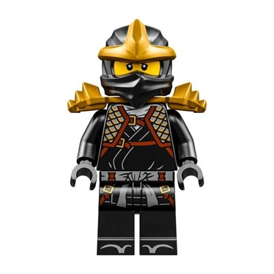 LEGO Cole ZX Legacy Update minifigure from the Ninjago Legacy subtheme. Cole wears dark blue-grey scale armor with reddish-brown straps, gold buckles, and decorations. Cole comes with pearl gold shoulder pieces with space for 2 swords.