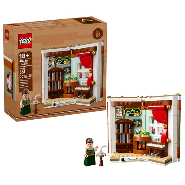 Store Gorinchem Not in stock LEGO Tribute to Jane Austen’s Books (40766) is an International Women’s Day celebration of the illustrious author. The detailed display model features a Jane Austen minifigure in her lovely home, which contains a small writing table with a quill, a piano with sheet music, a bookshelf, flowers, a cosy fireplace and paintings on the wall showing scenes from film adaptations of her books. A nameplate is attached to a sturdy base and, from the rear, the display model looks like a book.