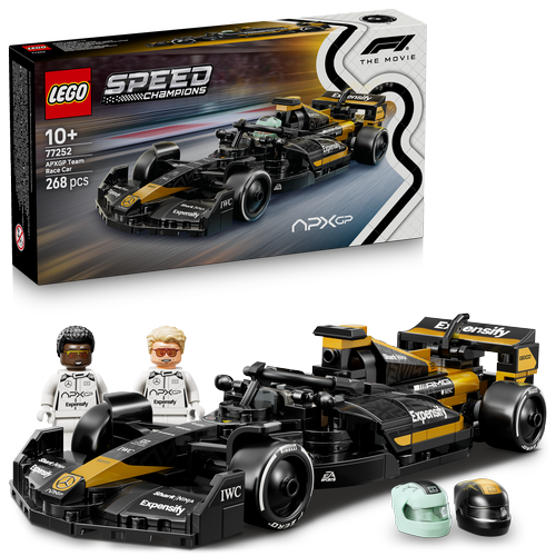 Boys and girls ages 10 and up will be thrilled to build, display and race this LEGO Speed Champions APXGP Team Race Car from F1 The Movie (77252). This brick-built model car kit includes many of the same design details from the version seen in the 2025 movie. This F1 toy car features design details from the movie car including its black and gold livery, sponsor stickers and wider rear tires imprinted with ’Pirelli’. The race car set also comes with 2 F1 driver minifigure characters from the movie: Sonny Hayes and Joshua Pearce, each with individual helmets featuring their signature, a wig and a wrench, which can also be used to apply stickers and separate bricks. LEGO Speed Champions building sets make great gifts for kids and car fans who can build replicas of some of the world’s most iconic vehicles. They can create each playset with confidence using the LEGO Builder app – zoom, rotate in 3D and track progress with easy-to-follow digital instructions.
