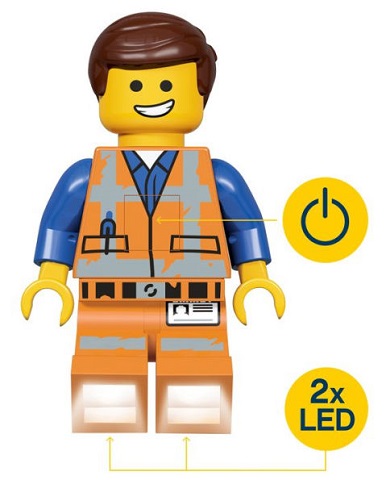 This The LEGO Movie 2 LED flashlight has 2 bright LEDs in the feet of Emmet the master builder. It can stand or sit on a flat surface and can also be held by hand.